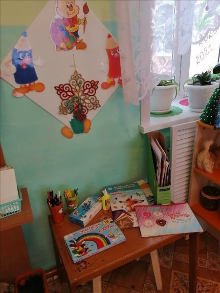 Краски акварельные, гуашь, цветные карандаши, мелки для рисования, пластилин, кисти, ватные палочки, раскраски, цветная и белая бумага, цветной картон. Ножница, стаканчики для воды, штампики и тд.