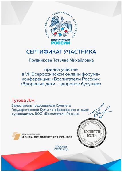 Сертификат участника. Всероссийский VII онлайн форум-конференций "Воспитатели России": "Здоровые дети-здоровое будущее"